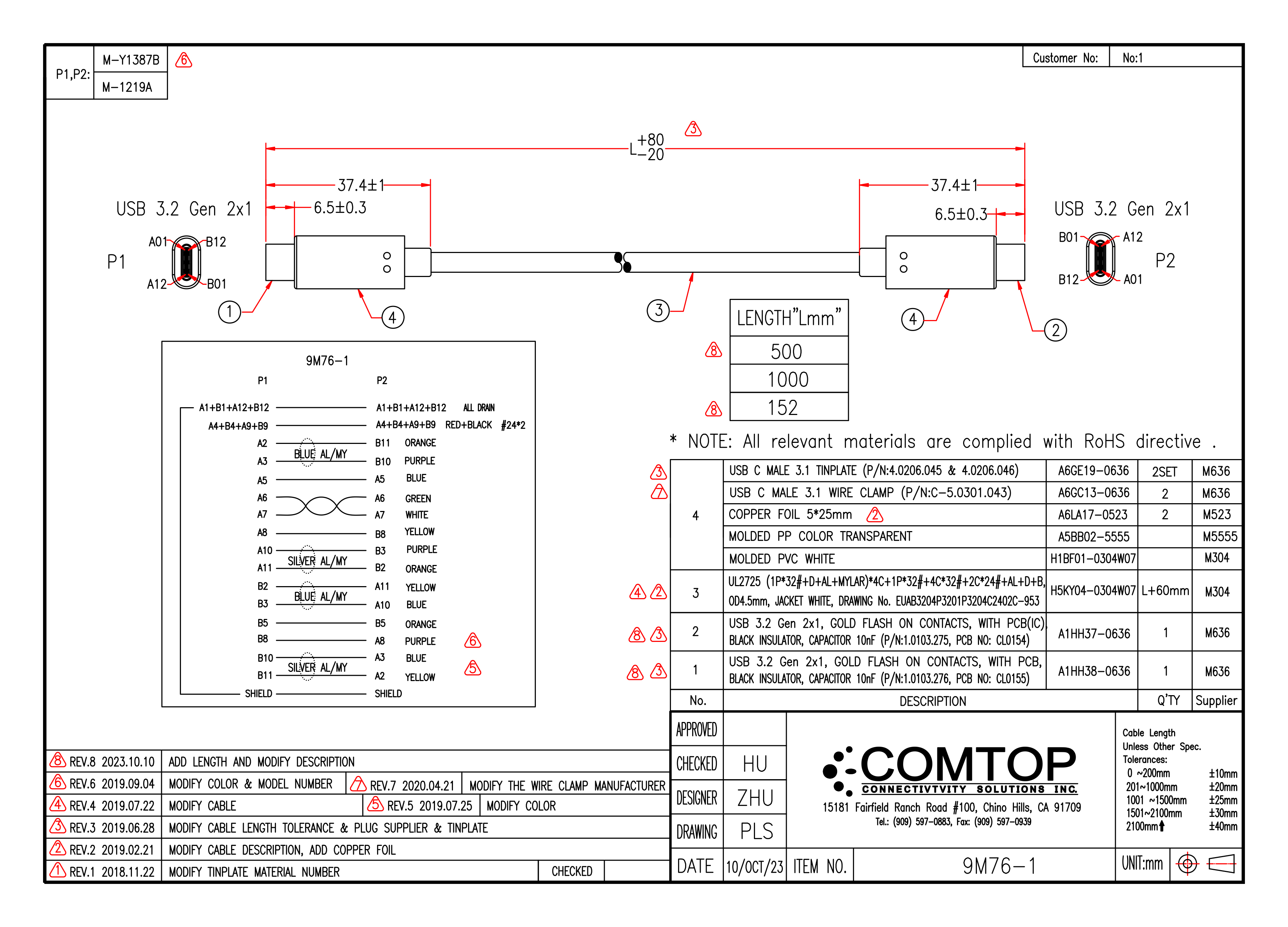 線路號 9M76-1 長度 1F-7FT 插頭編號 A1HH37-0636 、A1HH38-0636 線材規格 USB3.1(3.2)/32#/4P+1P+4C/24#/2C OD4.5 黑色 EUAB3204P3201P3204C2402C-853 顏色 黑色 參考安規 UL 附註 建議長度: 3FT、7FT