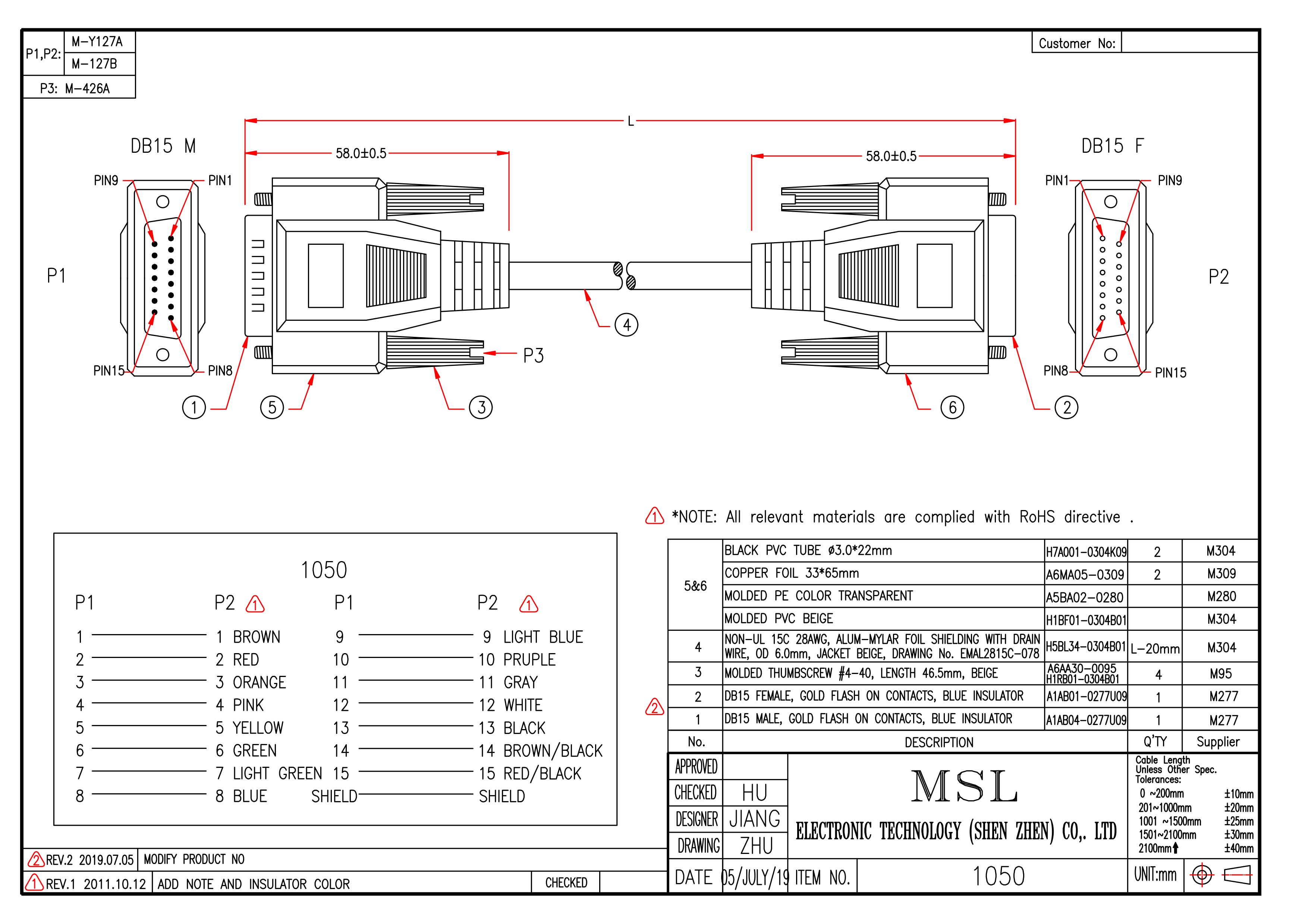 線路號 1050 長度 1FT - 10FT 插頭編號 A1AB04-0277U09 \ A1AB01-0277U09 線材規格 NON-UL 15C 28AWG, ALUM-MYLAR FOIL SHIELDING WITH DRAIN WIRE, OD 6.0mm, JACKET BEIGE, DRAWING NO. EMAL2815C-078 顏色 貝吉色、黑色、灰色 參考安規 UL
