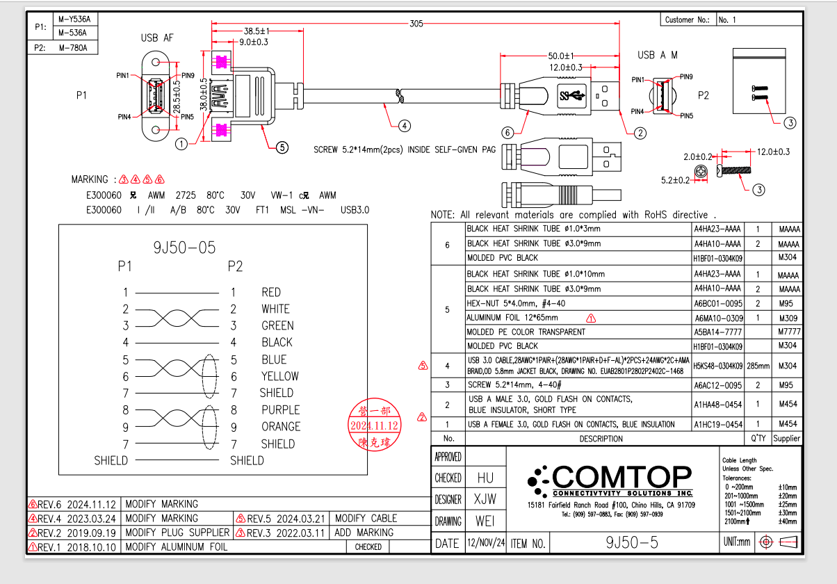 線路號 9J50-05 長度 0.5FT - 10FT 插頭編號 A1HC19-0454 \ A1HA48-0454 線材規格 USB 3.0 CABLE,28AWG*1PAIR+(28AWG*1PAIR+D+F-AL)*2PCS+24AWG*2C+AMA BRAID,OD 5.8mm JACKET BLACK, DRAWING NO. EUAB2801P2802P2402C-1468 顏色 貝吉色、黑色