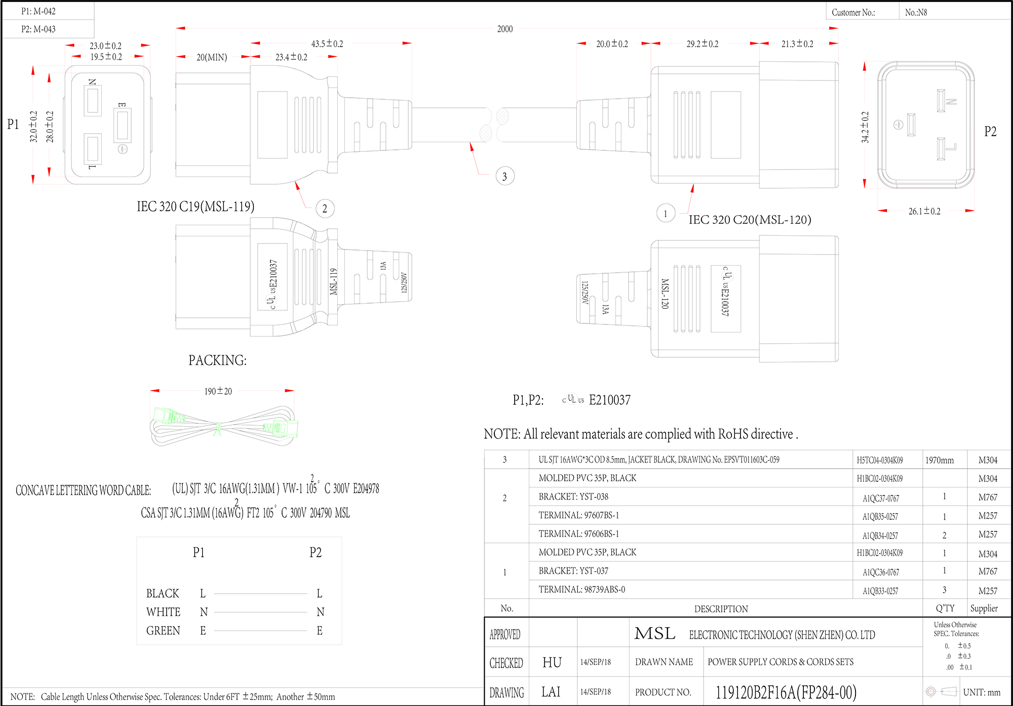 線路號 FP284-00 長度 0.5FT - 10FT 線材規格 UL SJT 16AWG*3C OD 8.5mm, JACKET BLACK, DRAWING No. EPSVT011603C-059 顏色 貝吉色、黑色 參考安規 UL