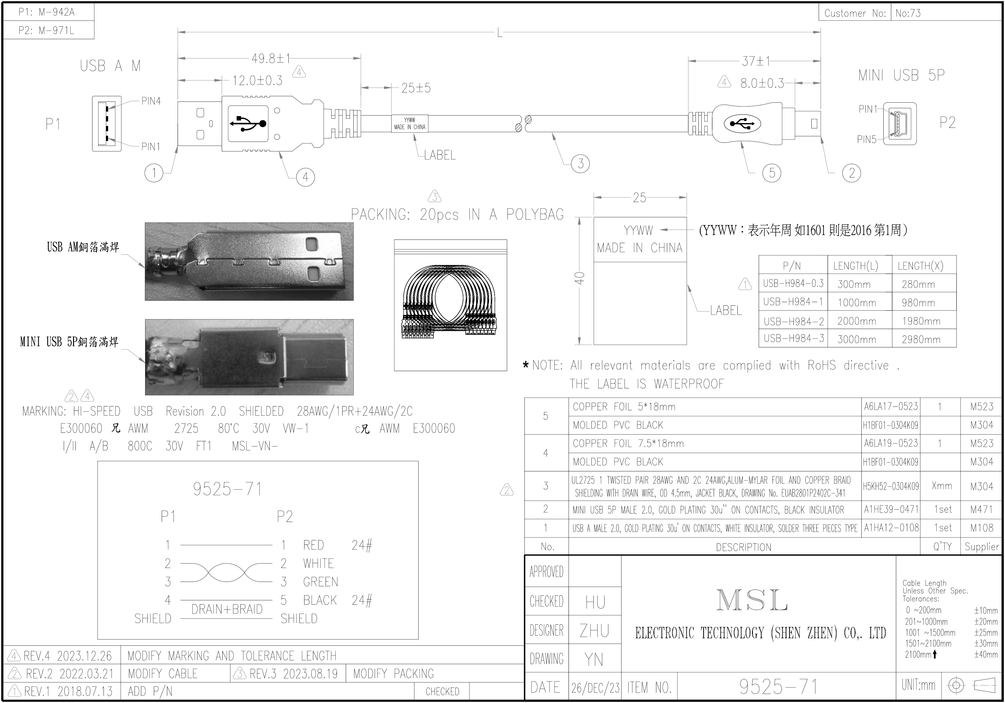 線路號 9525-71 長度 0.5FT - 10FT 插頭編號 A1HA12-0108,A1HE39-0471 線材規格 UL2725 1 TWISTED PAIR 28AWG AND 2C 24AWG,ALUM-MYLAR FOIL AND COPPER BRAID SHIELDING WITH DRAIN WIRE, OD 4.5mm, JACKET BLACK, DRAWING NO. EUAB2801P2402C-341 顏色 黑色 參考安規 UL