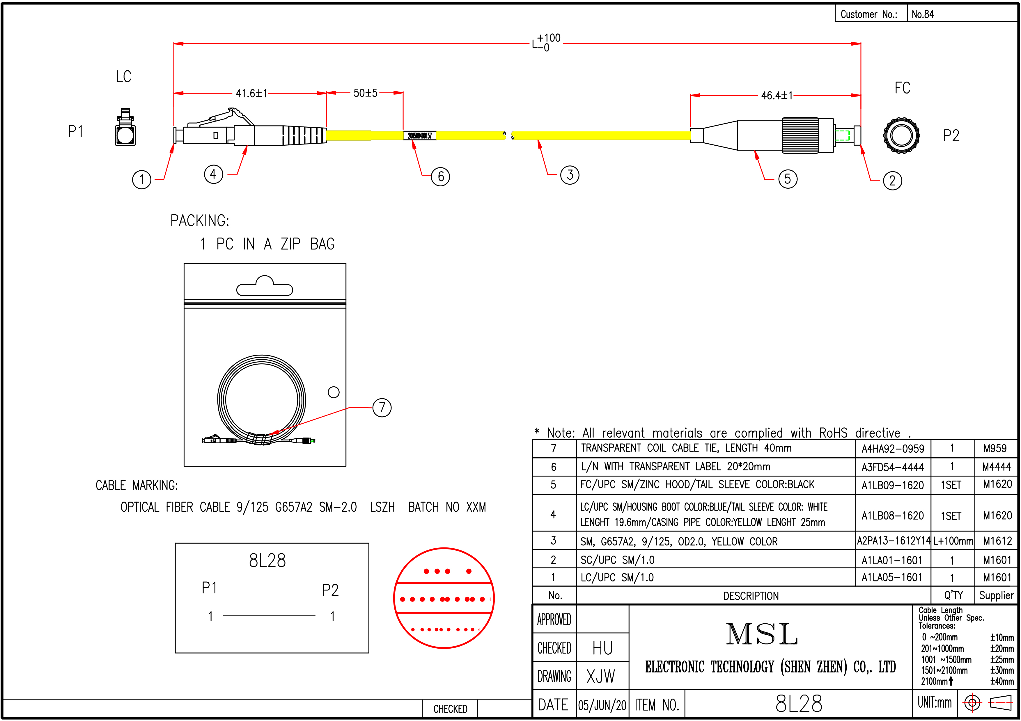 線路號 8L28 長度 0.5FT - 10FT 插頭編號 A1LA05-1601、A1LA01-1601 線材規格 SM,G657A2,9/125,0D2.0,YELLOW COLOR 顏色 黃色 參考安規 UL