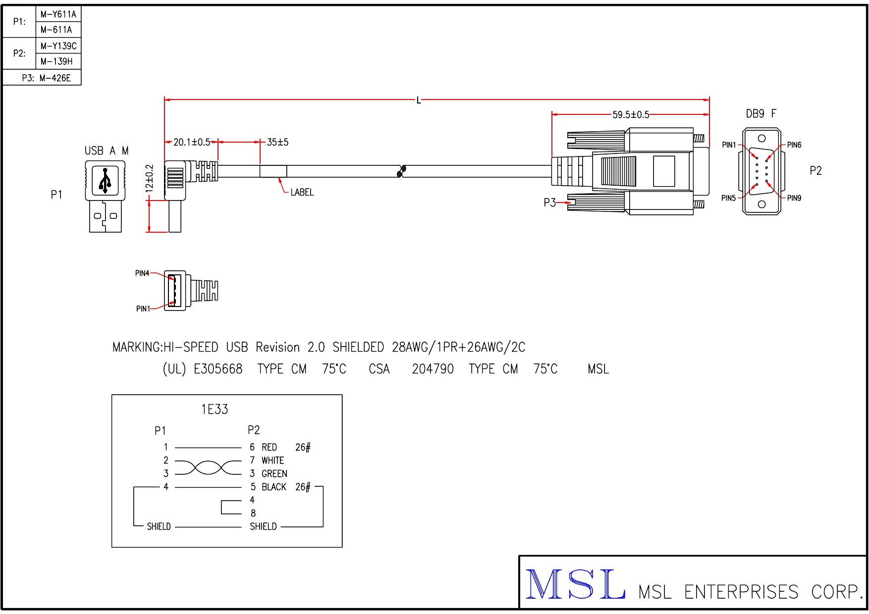 線路號 1E33 長度 0.85FT 插頭編號 A1AA01-0108K09、A1HA06-0108 線材規格 USB2.0 #28+#26 1P+2C OD4.5 ( EUAB2801P2602C-050) 顏色 黑色 參考安規 USB 附註 建議長度: 0.85FT