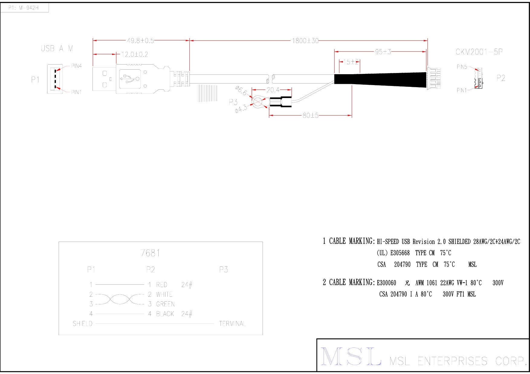 線路號 7681 長度 6.04FT 插頭編號 A1HA22-0454、A1RF04-0031、A1RF12-0031、A1RR45-0931 線材規格 USB2.0 #28+#24 1P+2C OD4.5 (EUAB2801P2402C-015) UL1061 #22 1C OD1.3 ( EH002201C-017) 顏色 黑色 參考安規 USB、UL 附註 建議長度: 6.04FT