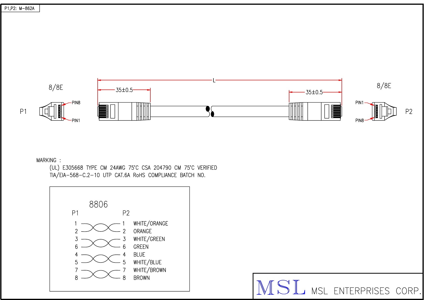線路號 8806 長度 0.55FT - 150FT 插頭編號 A1ND19-0205 線材規格 UTP CAT.6A #24 4PR OD6.9 (EU002404P-462) 顏色 白色、藍色、灰白色、黃色、黑色 參考安規 UL、CSA、TIA、EIA 附註 建議長度: 10FT、14FT