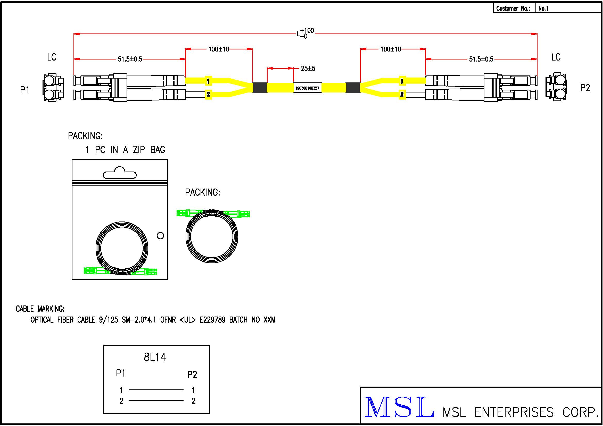 線路號 8L14 長度 1-20M 插頭編號 A1LA05-1601 A1LB02-1620 線材規格 SM DX G657A1 9/125 OD2.0*4.1mm黃色 E229789 外被阻燃:OFNR,光纖材質:康宁纤,紡綸紗 顏色 黃色 參考安規 UL