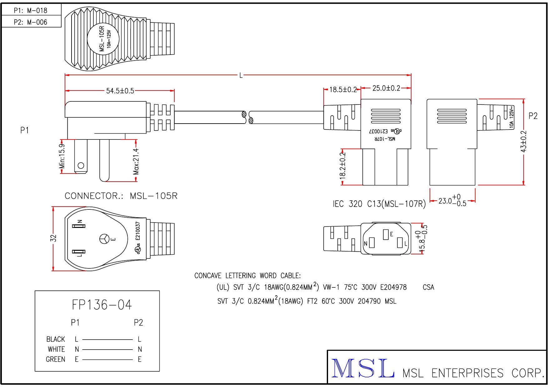 線路號 FP136-04 長度 2FT - 12FT 插頭編號 105R - 107R 插頭AMP / Vottage 10A - 125V 線材規格 UL SVT #18 3C OD6.3 (EPSVT011803C-008) 顏色 黑色 參考安規 UL、CUL 附註 建議長度: 3FT、 6FT
