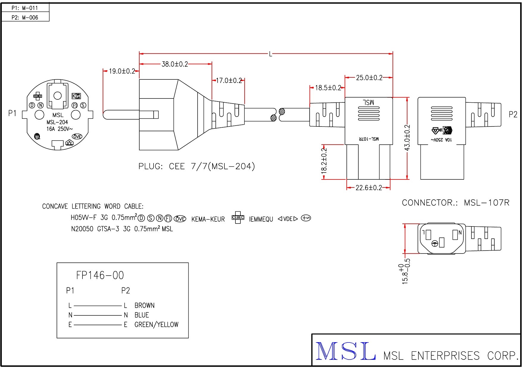 線路號 FP146-00 長度 6.56FT 插頭編號 204 - 107R 插頭AMP / Vottage 16A - 250V 10A - 250V 線材規格 H05VV-F 3G 0.75mm2 GTSA-3 OD6.8 ( EPH5V0107503C-004) 顏色 黑色 參考安規 CEBEC、KEMA-KEUR、DEMKO 、SEMKO 、NEMKO 、FIMKO 、IEMMEQU、OVE、VDE+ENEC、S+ SWISS、SAA 附註 建議長度: 6.56FT