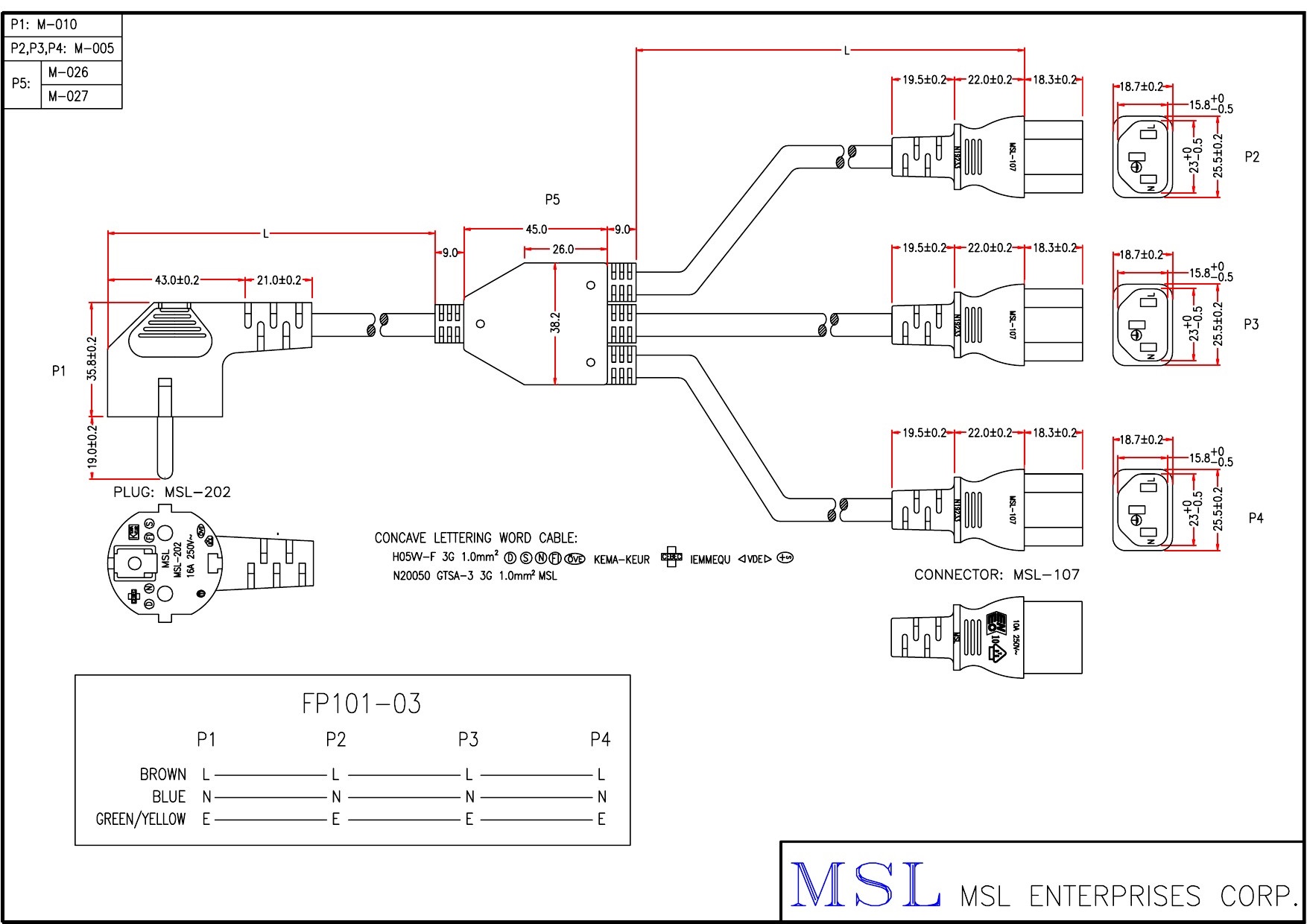 線路號 FP101-03 長度 10.24FT 插頭編號 202 - 107*3 插頭AMP / Vottage 16A - 250V 10A - 250V 線材規格 H05VV-F 3G 1.0mm2 GTSA-3 OD:7.1 (EPH5V011003C-005) 顏色 黑色 參考安規 此組合無認證 附註 建議長度: 10.24FT