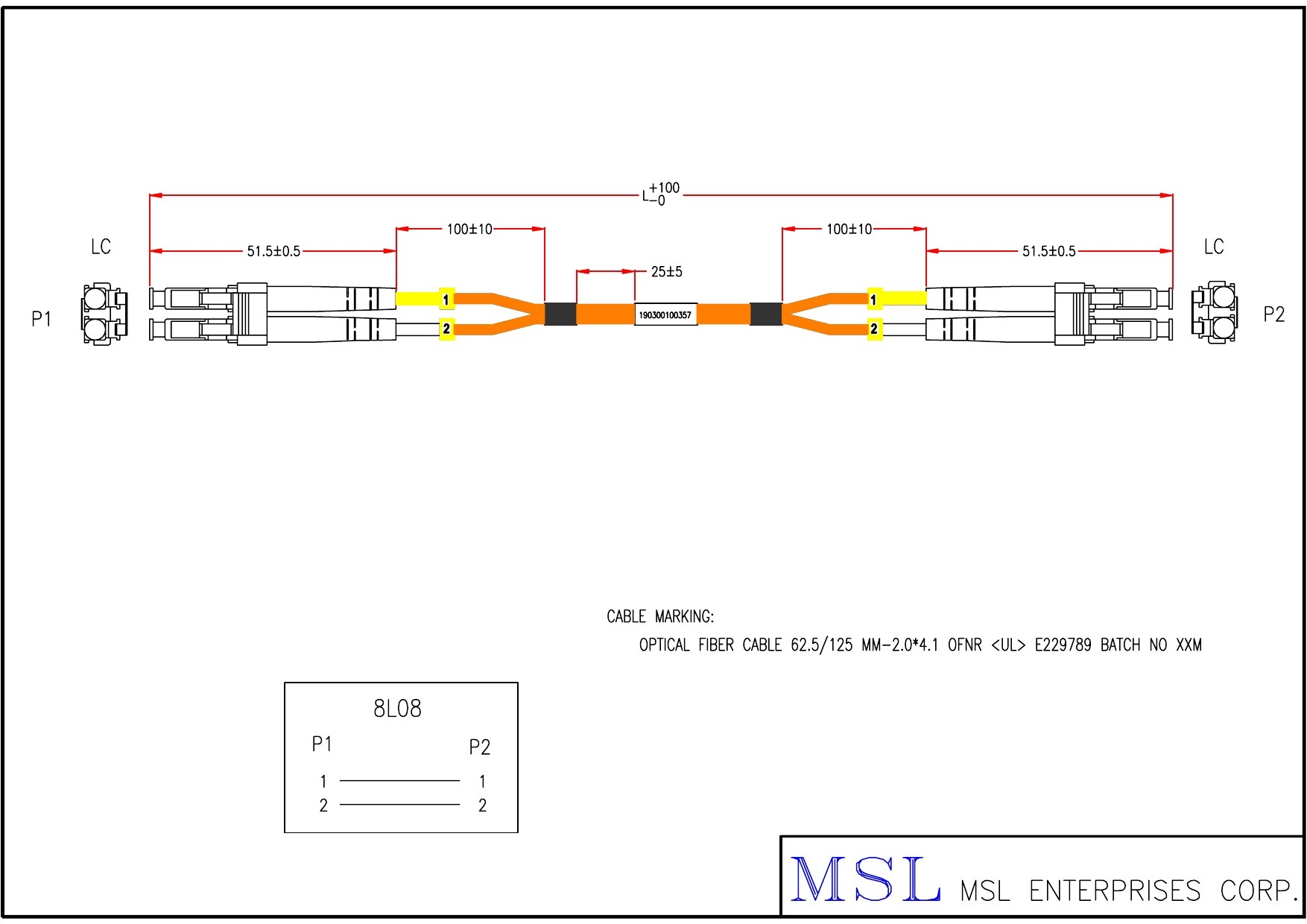 線路號 8L08 長度 1-30M 插頭編號 A1LA06-1601 A1LB01-1620 線材規格 MM DX OM1 62.5/125 OD2.0*4.1mm 橘色 E229789 外被阻燃:OFNR,光纖材質:康宁纤,紡綸紗 顏色 橘色 參考安規 UL