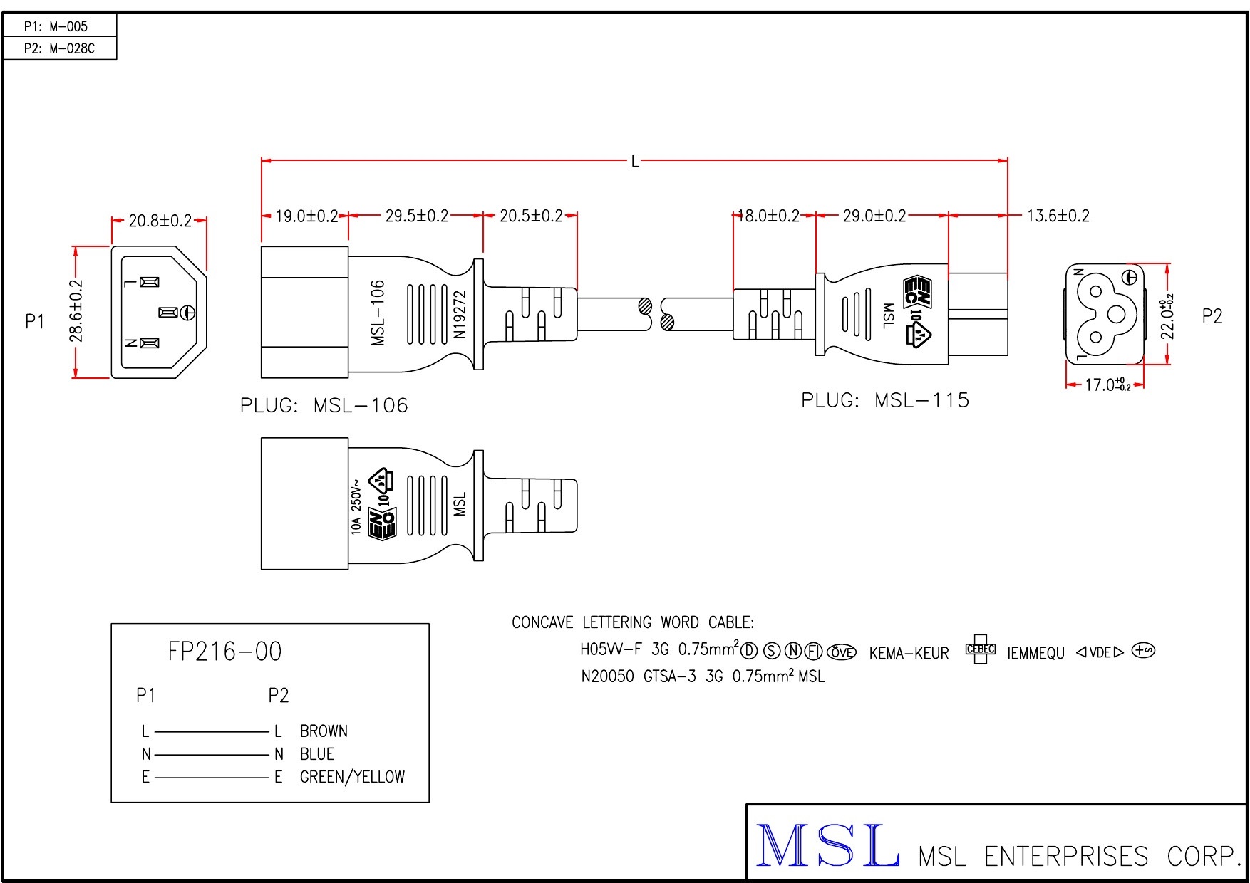 線路號 FP216-00 長度 6.56FT - 10FT 插頭編號 106 - 115 插頭AMP / Vottage 10A - 250V 2.5A - 250V 線材規格 H05VV-F 3G 0.75mm2 GTSA-3 OD6.8 ( EPH5V0107503C-004) 顏色 黑色 參考安規 VDE+ENEC 附註 建議長度: 6.56FT、 10FT