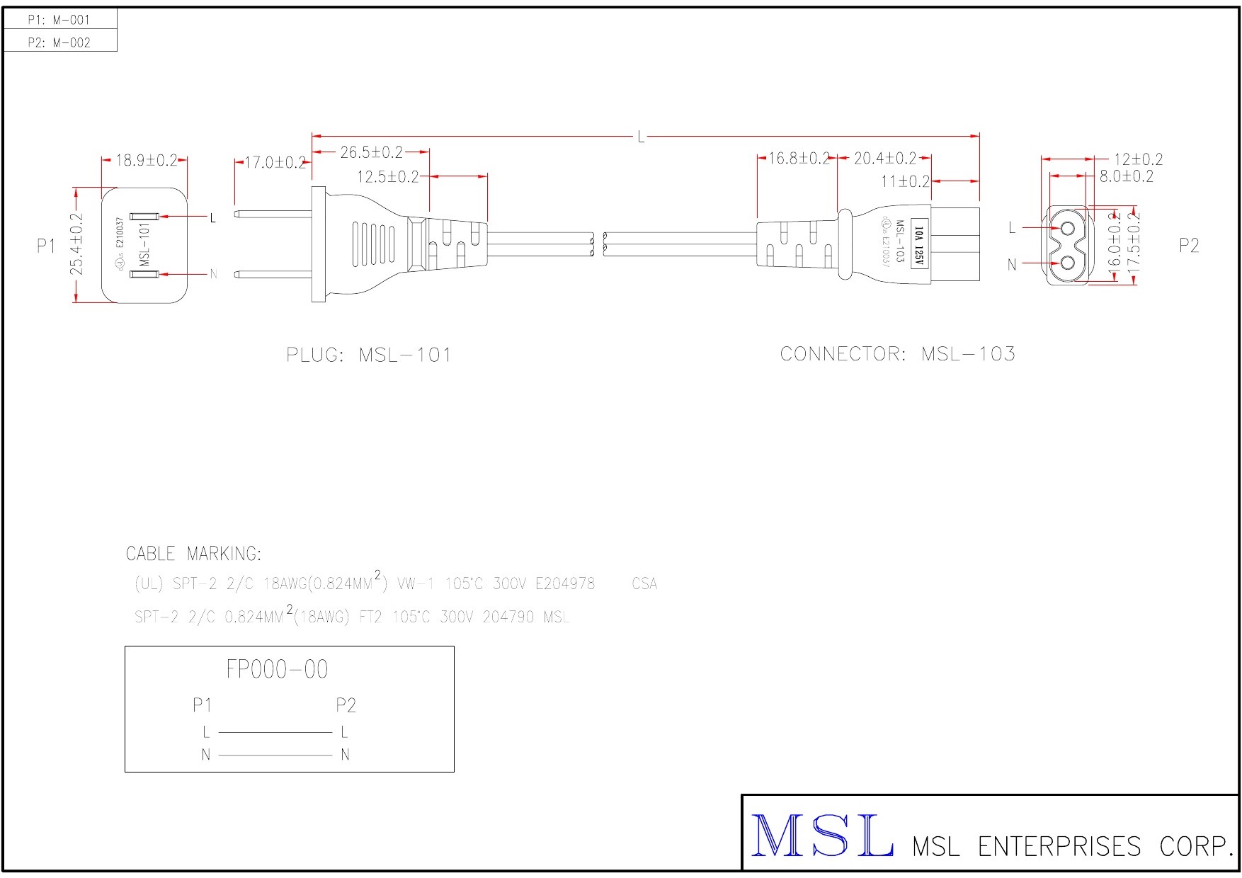 線路號 FP000-00 長度 5.9FT - 25FT 插頭編號 101 - 103 插頭AMP / Vottage 10A - 125V 線材規格 ULSPT-2 #18 2C OD3.5*6.9(EPSPT001802C-050) 顏色 白色、黑色 參考安規 UL、CUL、CSA 附註 建議長度: 6FT、 10FT