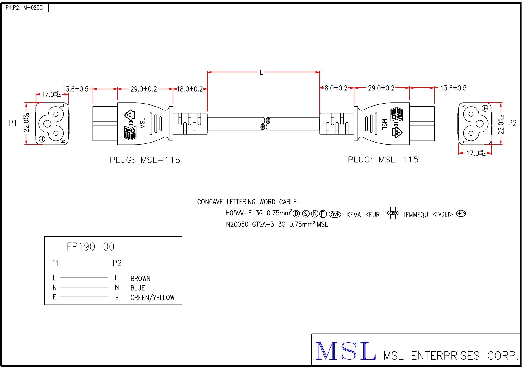 線路號 FP190-00 長度 1.27FT 插頭編號 115 - 115 插頭AMP / Vottage 2.5A - 250V 線材規格 H05VV-F 3G 0.75mm2 GTSA-3 OD6.8 ( EPH5V0107503C-004) 顏色 黑色 參考安規 VDE+ENEC 附註 建議長度: 1.27FT