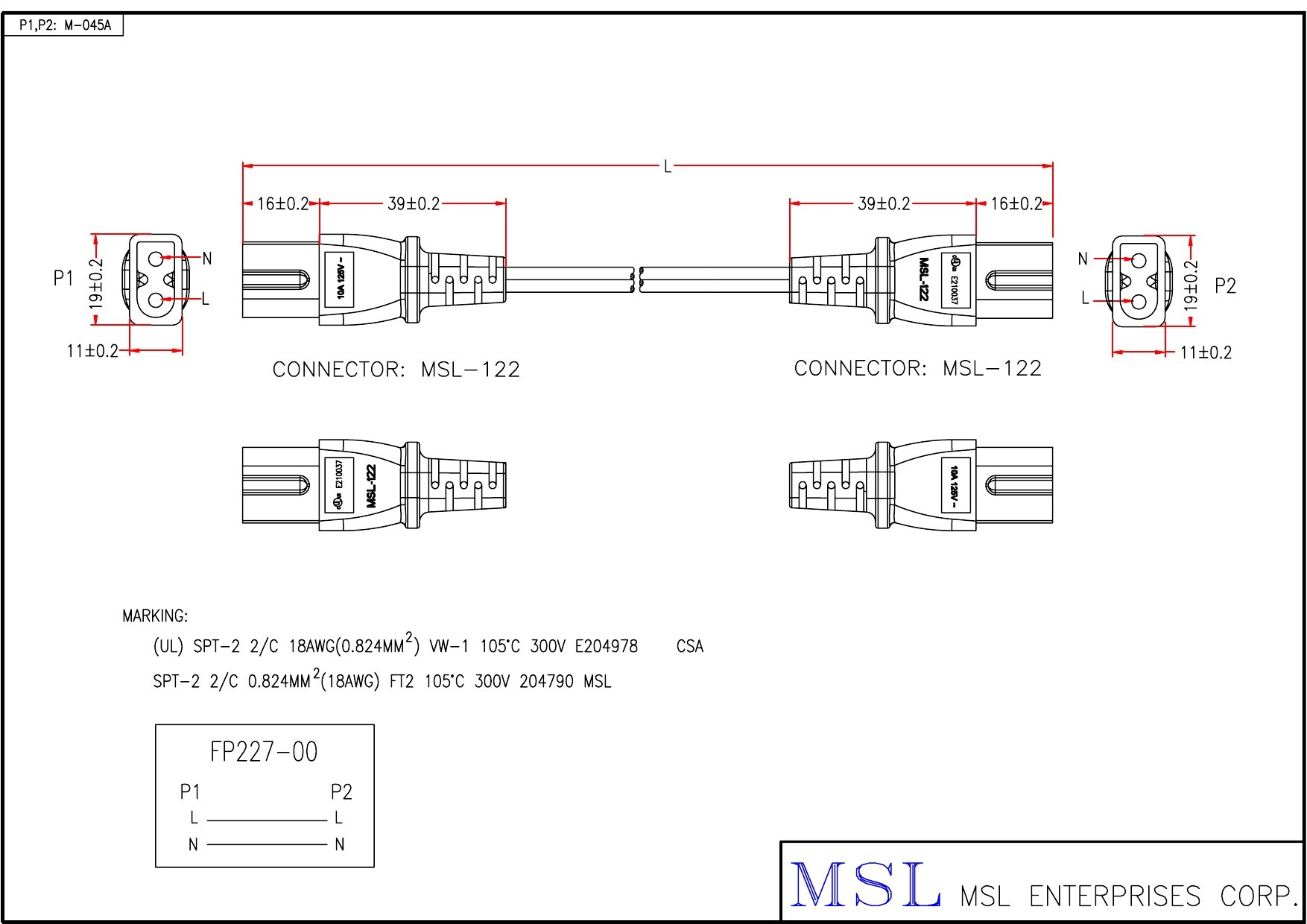 線路號 FP227-00 插頭編號 122 - 122 插頭AMP / Vottage 10A - 125V 線材規格 ULSPT-2 #18 2C OD3.5*6.9 (EPSPT001802C-014) 顏色 黑色 參考安規 UL、CUL