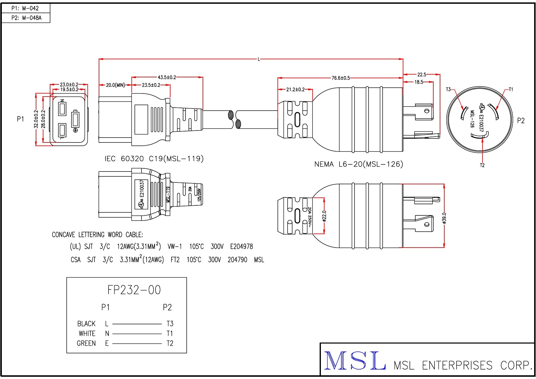 線路號 FP232-00 長度 6 FT - 15 FT 插頭編號 119 - 126 插頭AMP / Vottage 20A - 125/250V 20A - 250V 線材規格 UL SJT 12AWG x 3C 105C OD 11.0mm (EPSJT011203C-158) 顏色 黑色 參考安規 UL、CUL 附註 建議長度: 10FT、 15FT