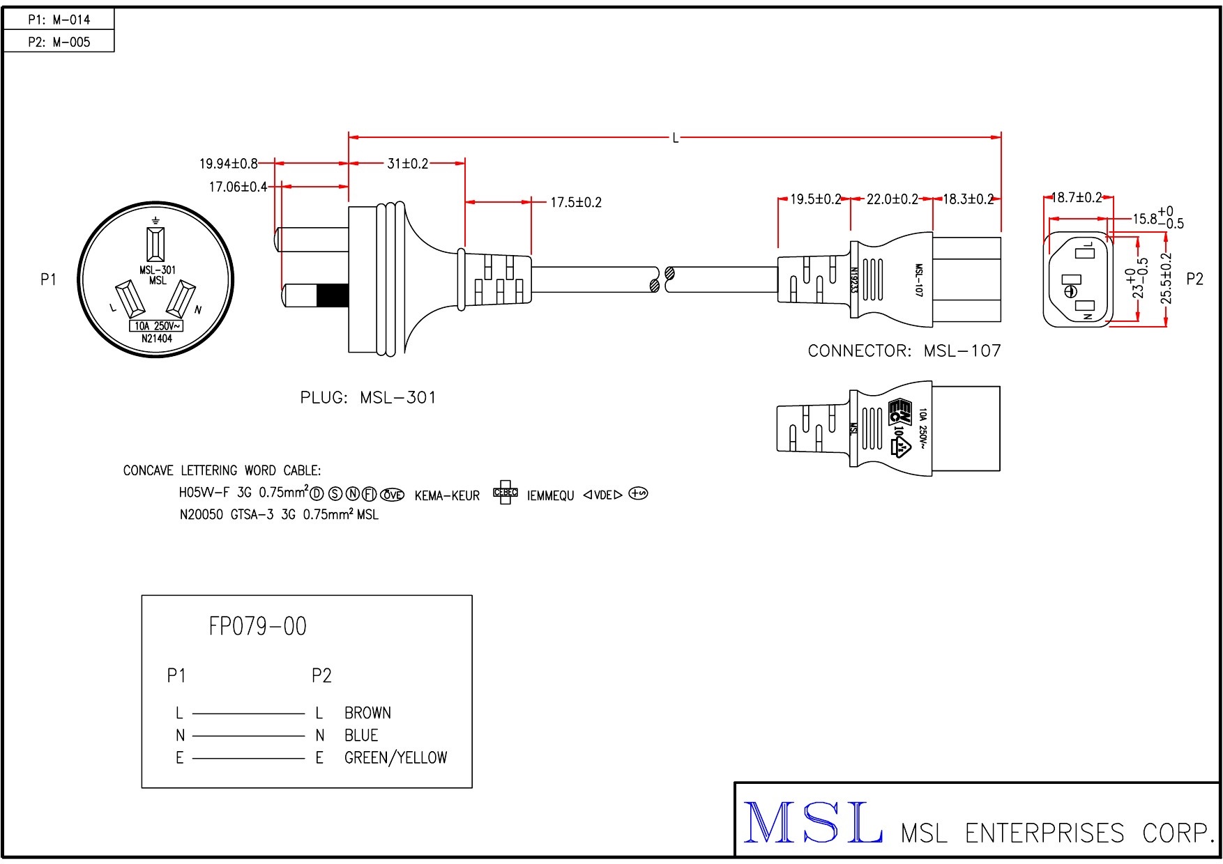 線路號 FP079-00 長度 0.5FT - 10FT 插頭編號 A1QC21-0767,A1QC61-0767 插頭AMP / Vottage 10A - 250V 線材規格 H05W-F 3G 0.75mm² GTSA-3 OD 6.8mm, JACKET BLACK, DRAWING NO. EPH5V0107503C-042 顏色 黑色 參考安規 VDE/ENEC