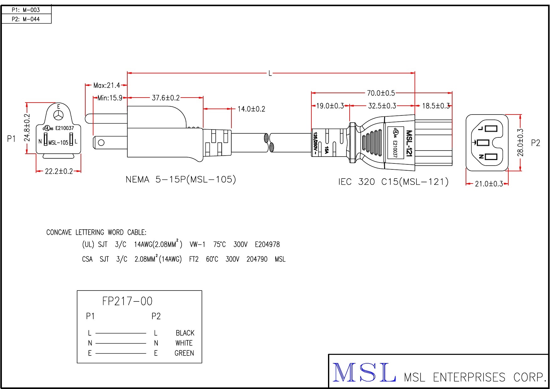 線路號 FP217-00 插頭編號 105 - 121 插頭AMP / Vottage 15A - 125V 15A -125/ 250V 線材規格 UL SJT #14 3C OD9.3 (EPSVT011403C-012) 顏色 黑色 參考安規 UL、CUL