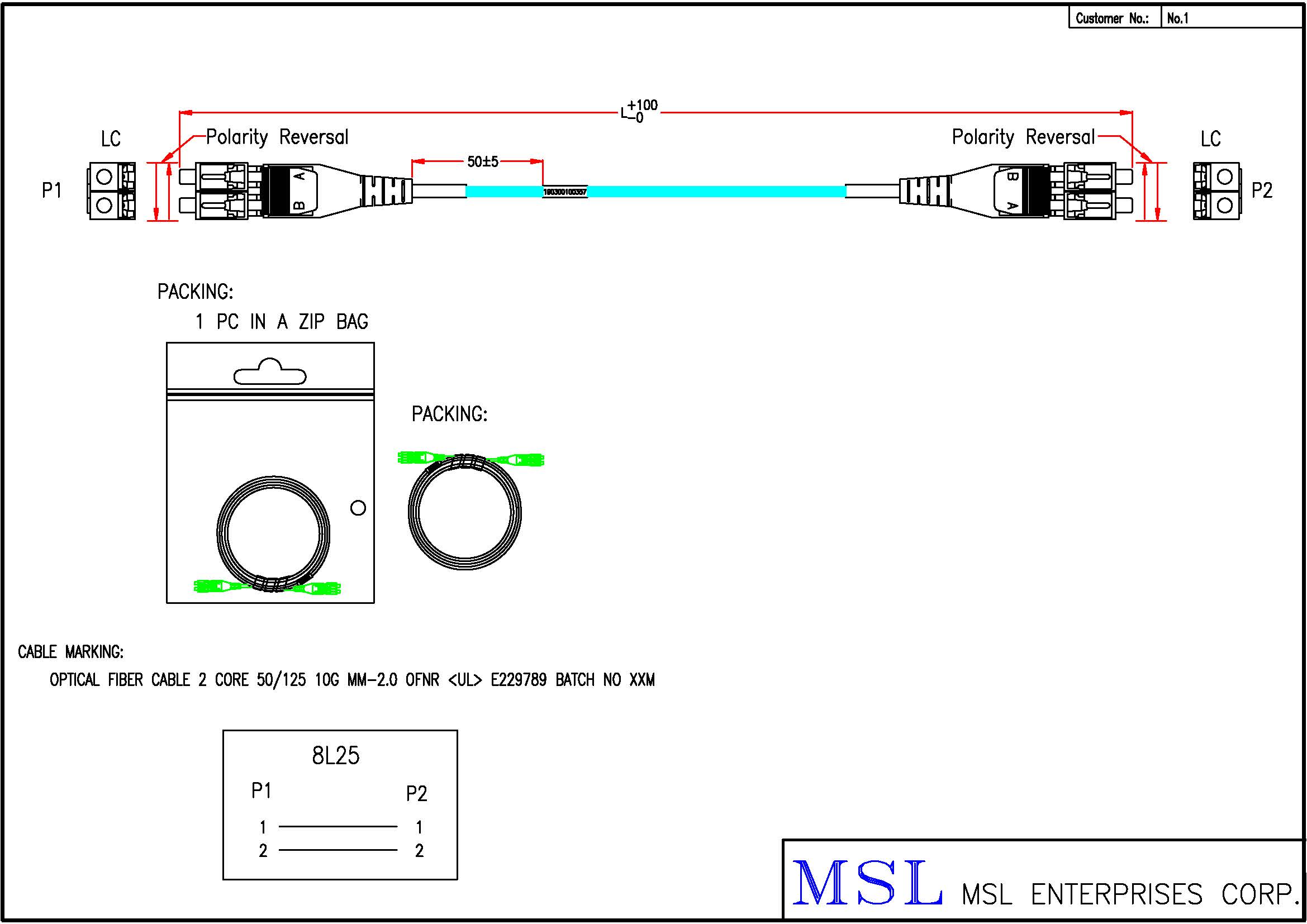 線路號 8L25 長度 1-15M 插頭編號 A1LA06-1601 A1LB17-1620 線材規格 MM DX OM3 10G 50/125 OD2.0mm 單管雙芯 水藍色 E229789 外被阻燃:OFNR,光纖材質:康宁纤,紡綸紗 顏色 水藍色 參考安規 UL