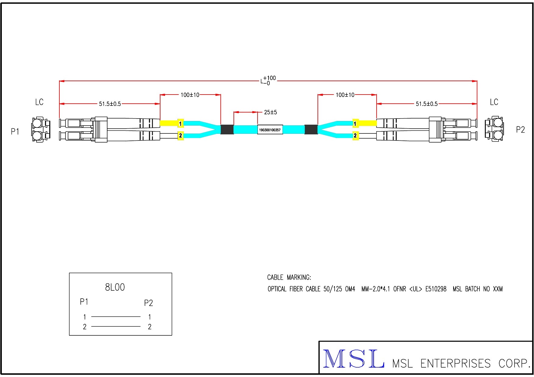 線路號 8L00 長度 1-30M 插頭編號 A1LA06-1601,A1LB01-1620 線材規格 MM DX OM4 50/125 OD2.0*4.1mm水藍色 E229789 外被阻燃:OFNR , 光纖材質:康宁纤 , 紡綸紗 顏色 水藍色 參考安規 UL