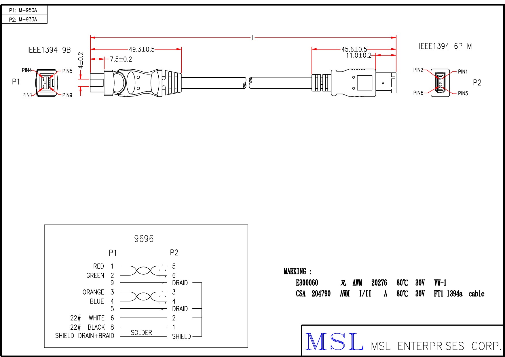 線路號 9696 長度 1FT - 32.8FT 插頭編號 A1HN04-0108、A1HM01-0108 線材規格 UL20276 IEEE-1394A #28+#22 (2P+2C+AB) OD6.0 (EUAB2802P2202C-353) 顏色 黑色、透明色 參考安規 UL 附註 建議長度: 6FT、9.84FT