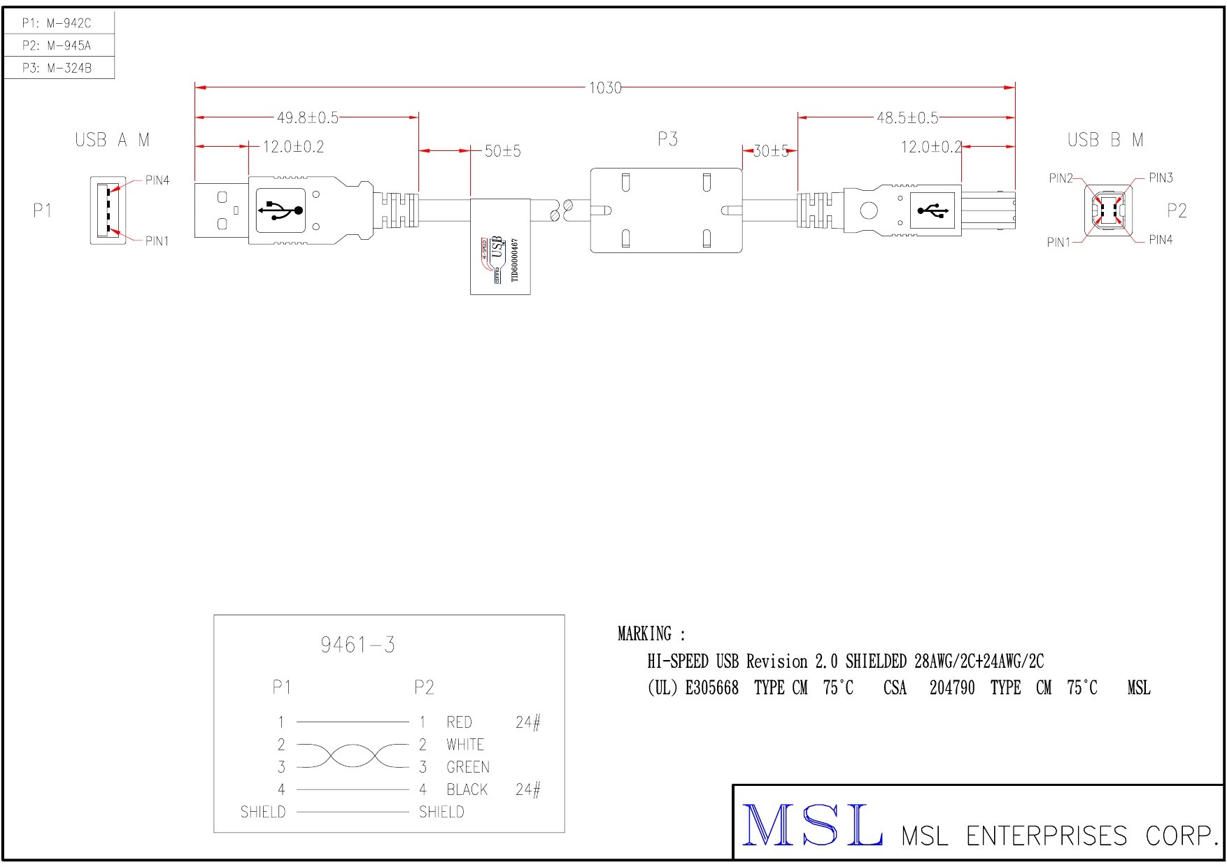線路號 9461-3 長度 3.28FT - 9.84FT 插頭編號 A1HA23-0108、A1HB16-0108 線材規格 USB2.0 #28+#24 1P+2C OD4.7 (EUAB2801P2402C-145) 顏色 黑色、淺灰色 參考安規 UL 附註 建議長度: 3.31FT、6.56FT