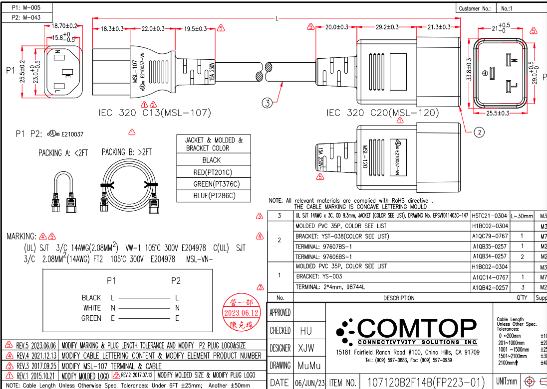| Wire specification | UL SJT 14AWG x 3C, OD 9.3mm, JACKET (COLOR SEE LIST), DRAWING No. EPSVT011403C-147 |