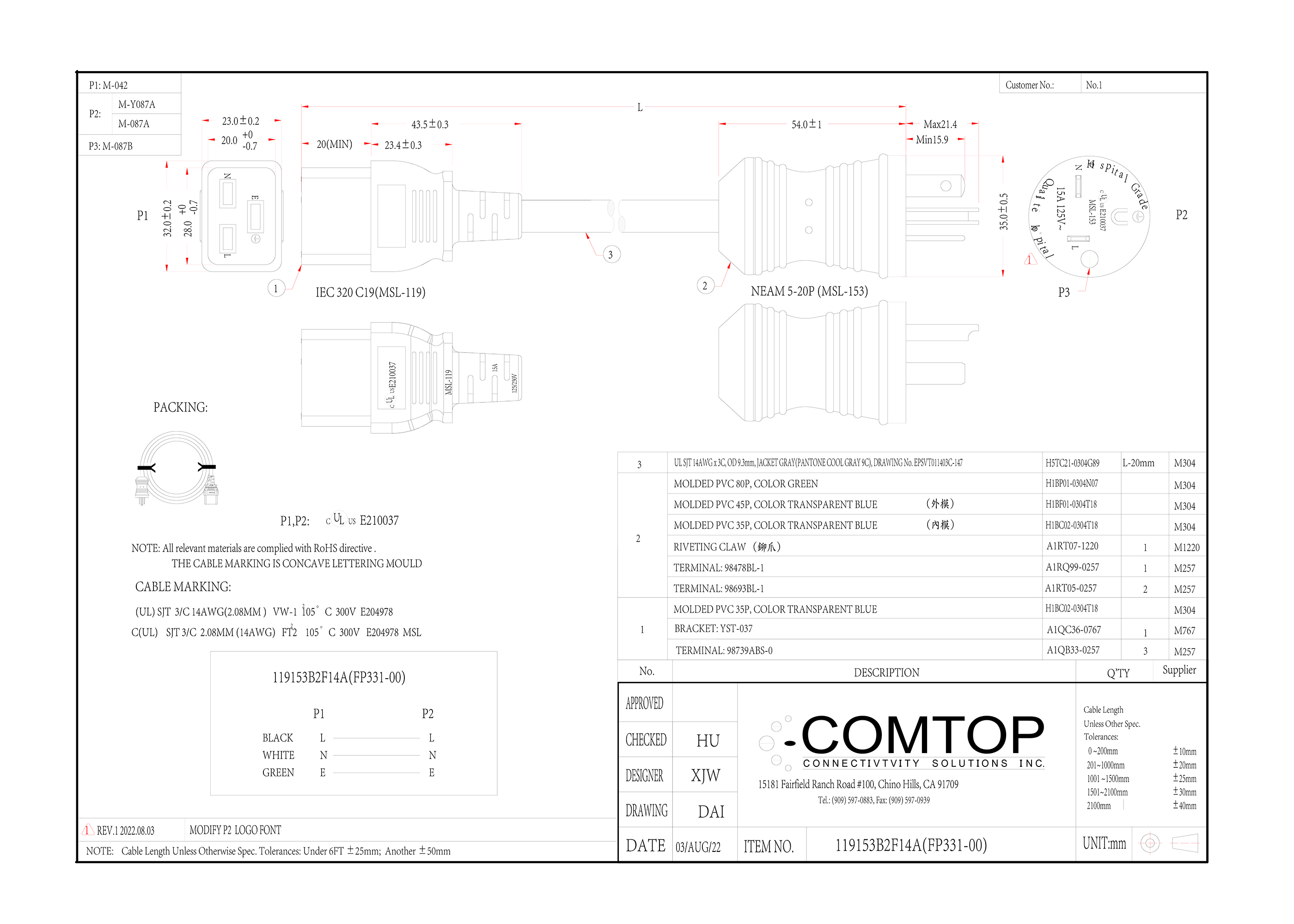Wire specification UL SJT 14AWG x 3C, OD 9.3mm, JACKET GRAY(PANTONE COOL GRAY 9C), DRAWING No. EPSVT011403C-147