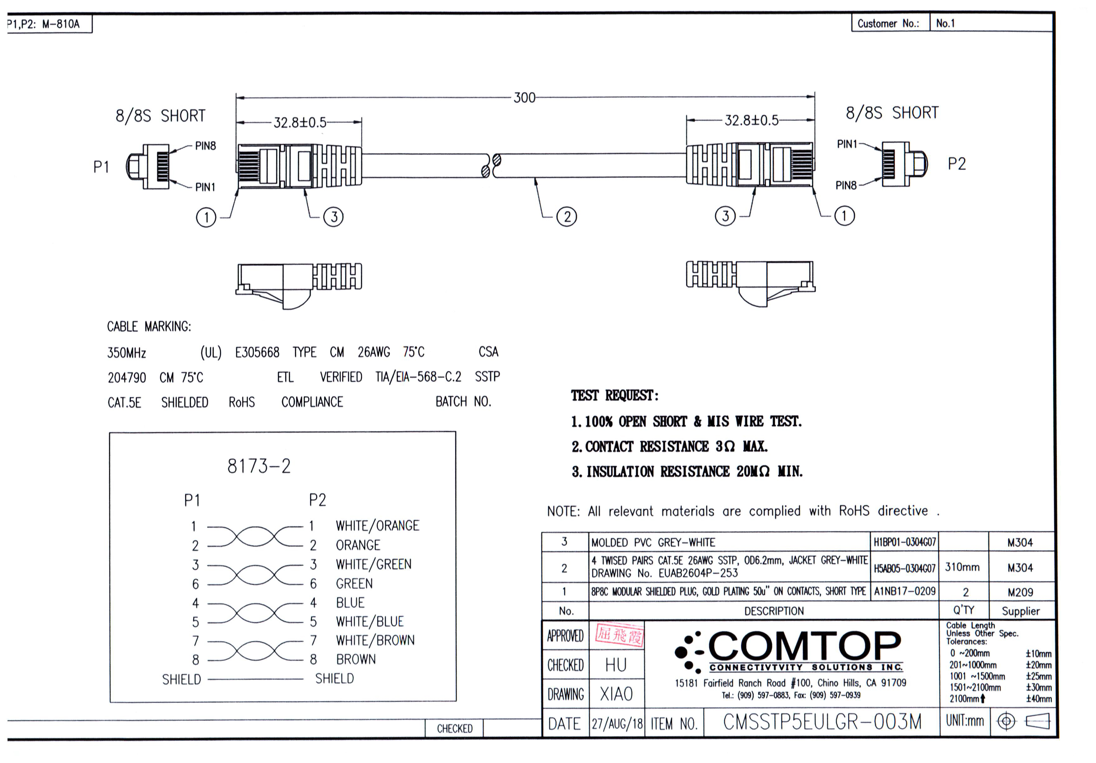 | Wire specification | 4 TWISED PAIRS CAT.5E 26AWG SSTP,0D6.2mm, JACKET GREY-WHITE DRAWING NO.EUAB2604P-253 |