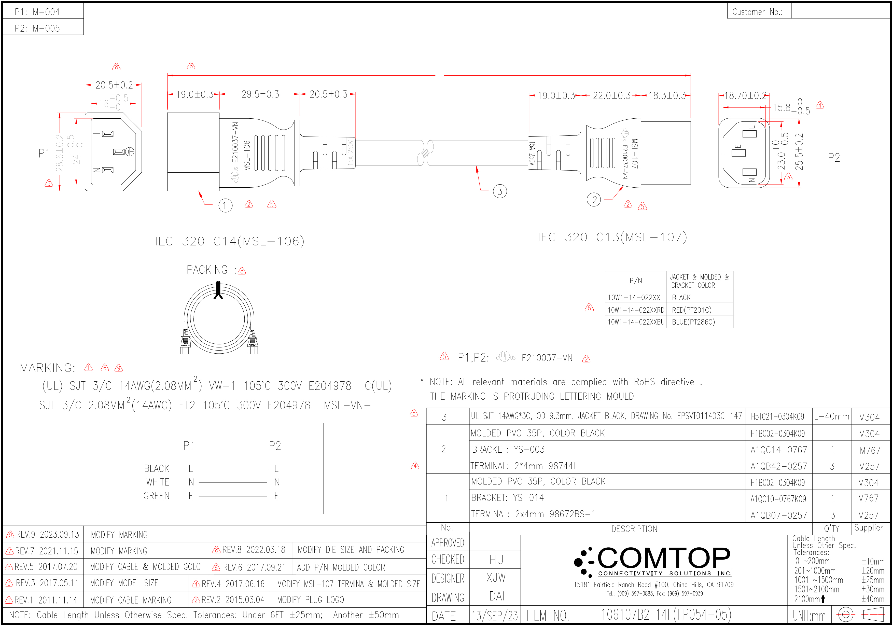 | Wire specification | UL SJT 14AWG*3C,OD 9.3mm, JACKET BLACK,DRAWING NO.EPSVT011403C-147 |