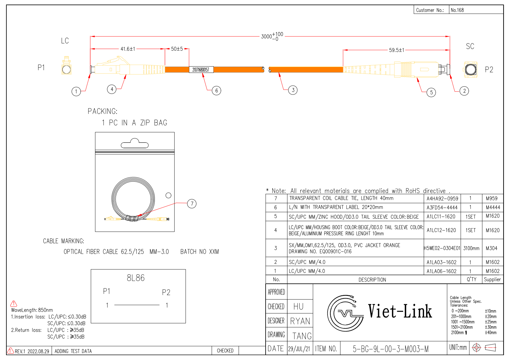 | Wire specification | SX/MM.0M1, 62.5/125, 0D3.0, PVC JACKET ORANGE DRAWING NO. EQ00901C-016 |
