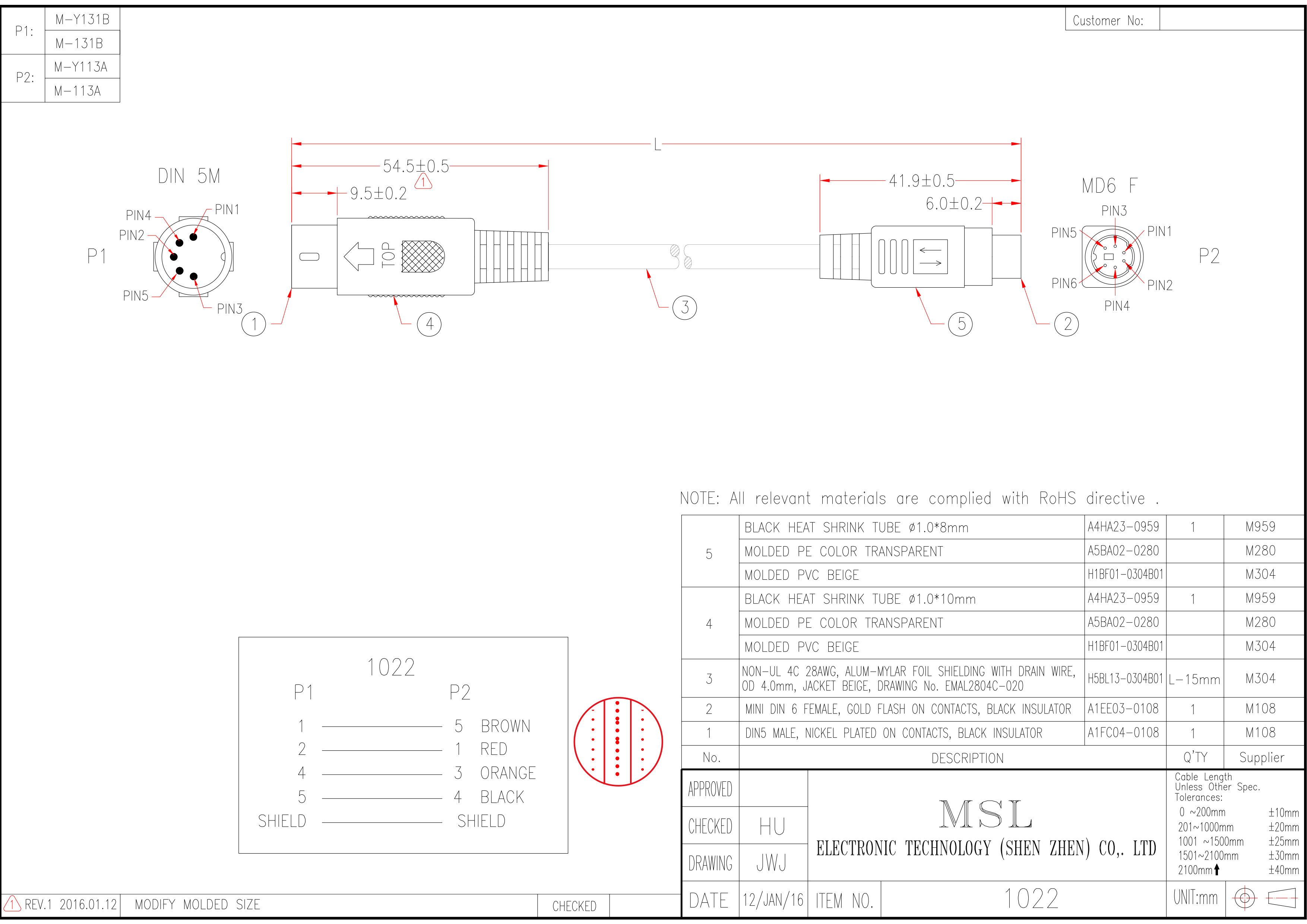 | Wire specification | NON-UL 4C 28AWG, ALUM-MYLAR FOIL SHIELDING WITH DRAIN WIRE, OD 4.0mm, JACKET BEIGE, DRAWING NO. EMAL2804C-020 |