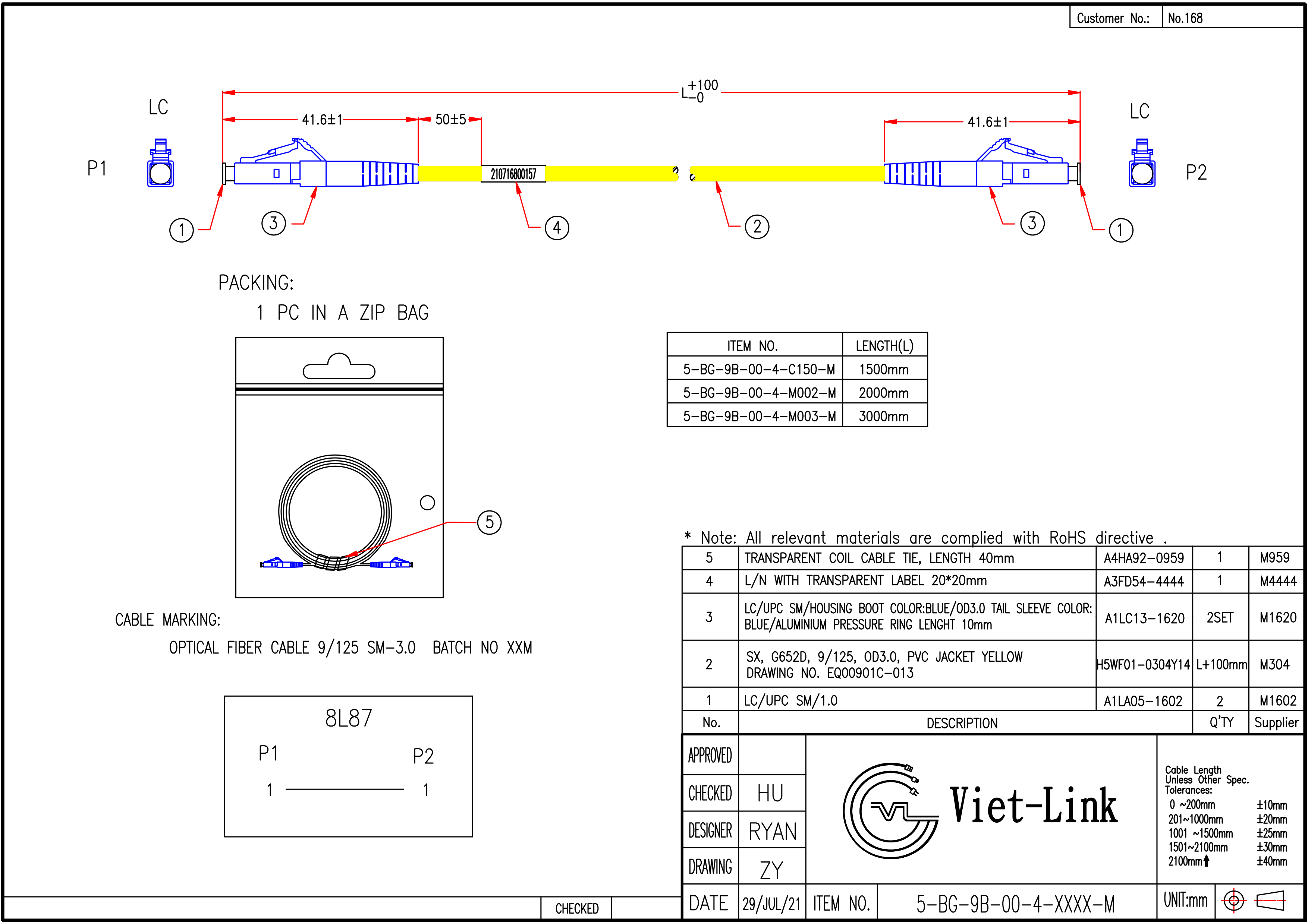 Wire specification SX, G652D, 9/125, OD3.0, PVC JACKET YELLOW DRAWING NO. EQ00901C-013