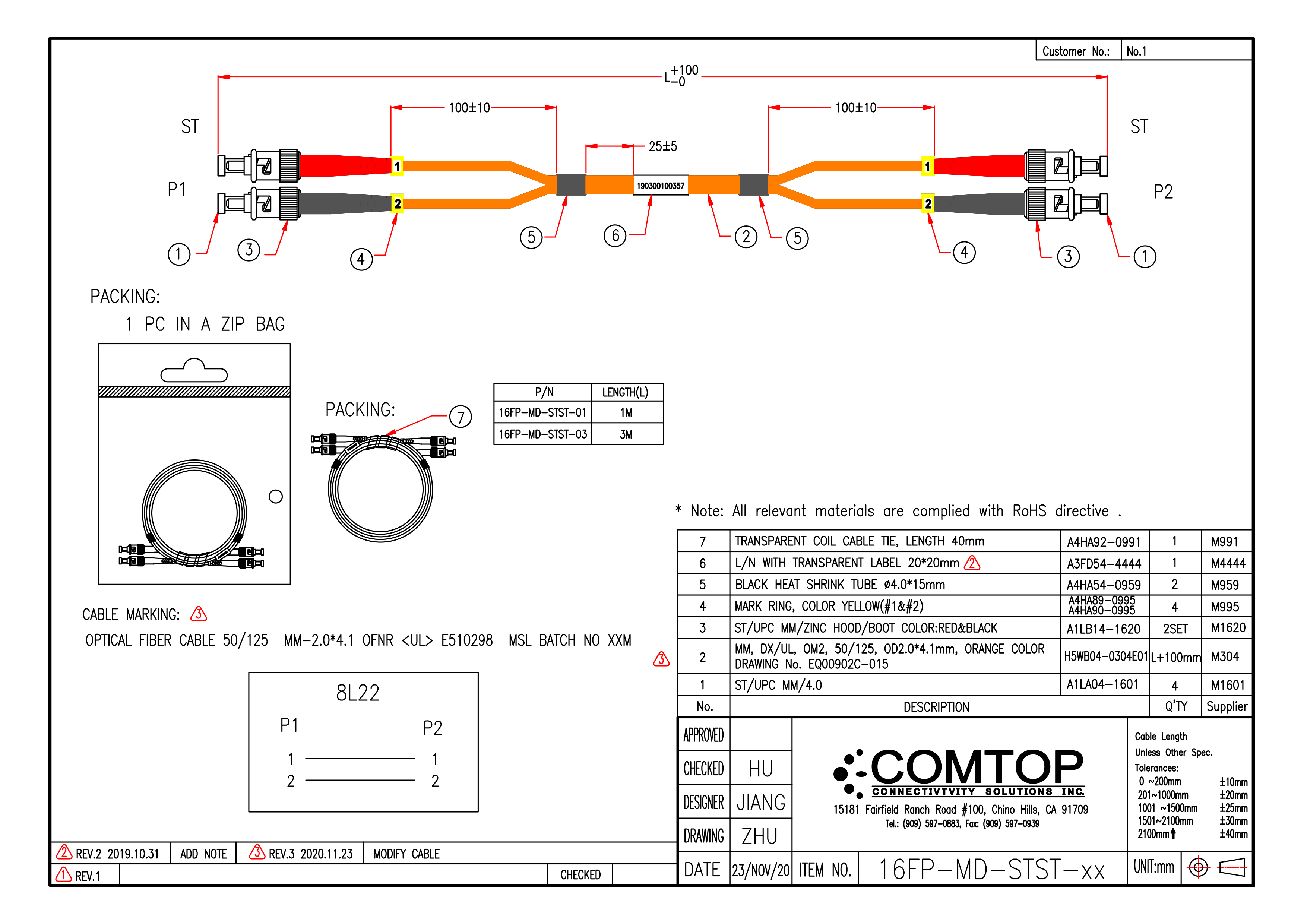 | Wire specification | Multi Mode Duplex OM2 50/125 OD2.0*4.1mm OFNR |